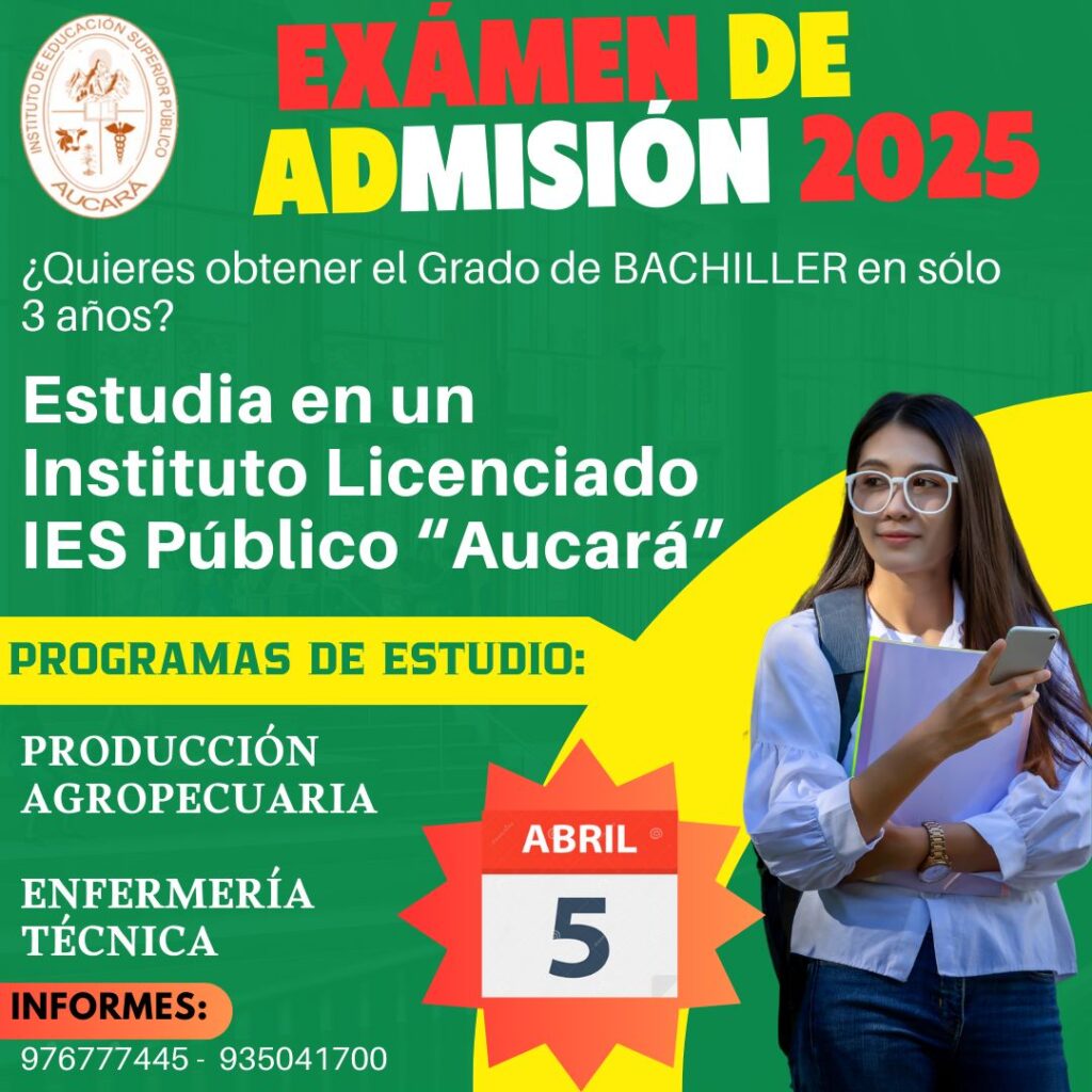 El Instituto de Educación Superior Tecnológico Público “Aucará” creado el 17 de diciembre de 1987 mediante la R.M. Nº 895-87-ED, convoca al proceso de Admisión 2025 ofertando los siguientes Programas de Estudios:
